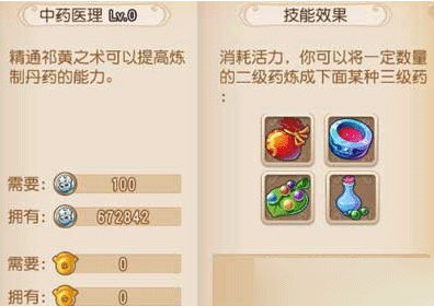 技能效果:消耗活力,可以将一定数量的二级药炼成某种三级药。